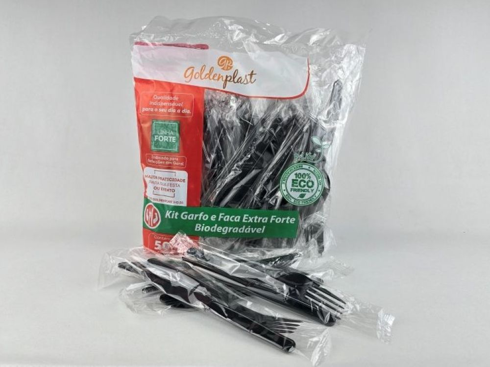 O Kit Garfo e Faca Preto Embalado da Goldenplast é composto por talheres descartáveis em poliestireno, embalados individualmente para garantir higiene e praticidade. Com acabamento elegante na cor preta, é ideal para marmitarias, eventos e serviços de alimentação que valorizam apresentação e funcionalidade. Disponível em pacotes com 50 kits ou caixas com 8 pacotes.